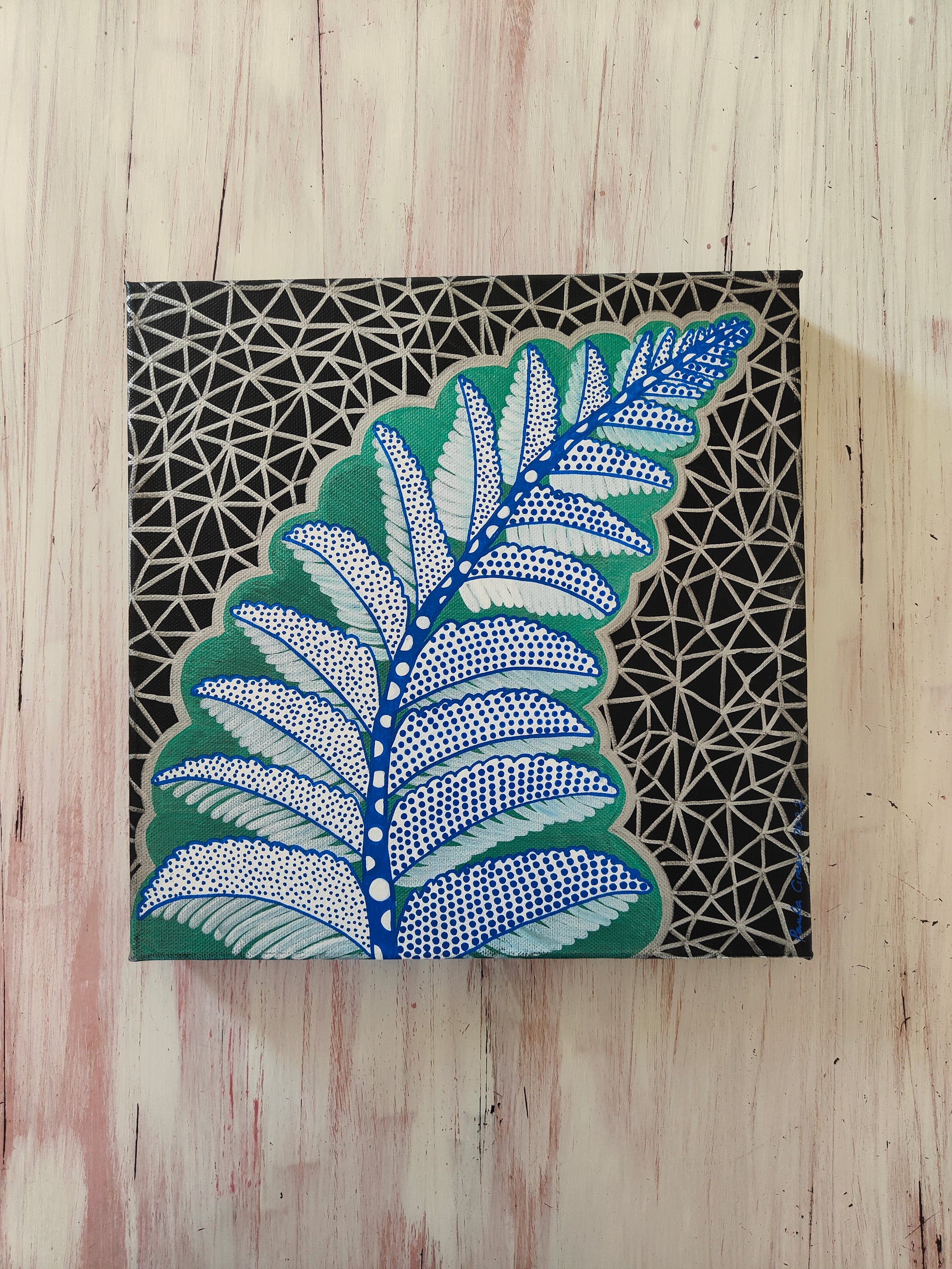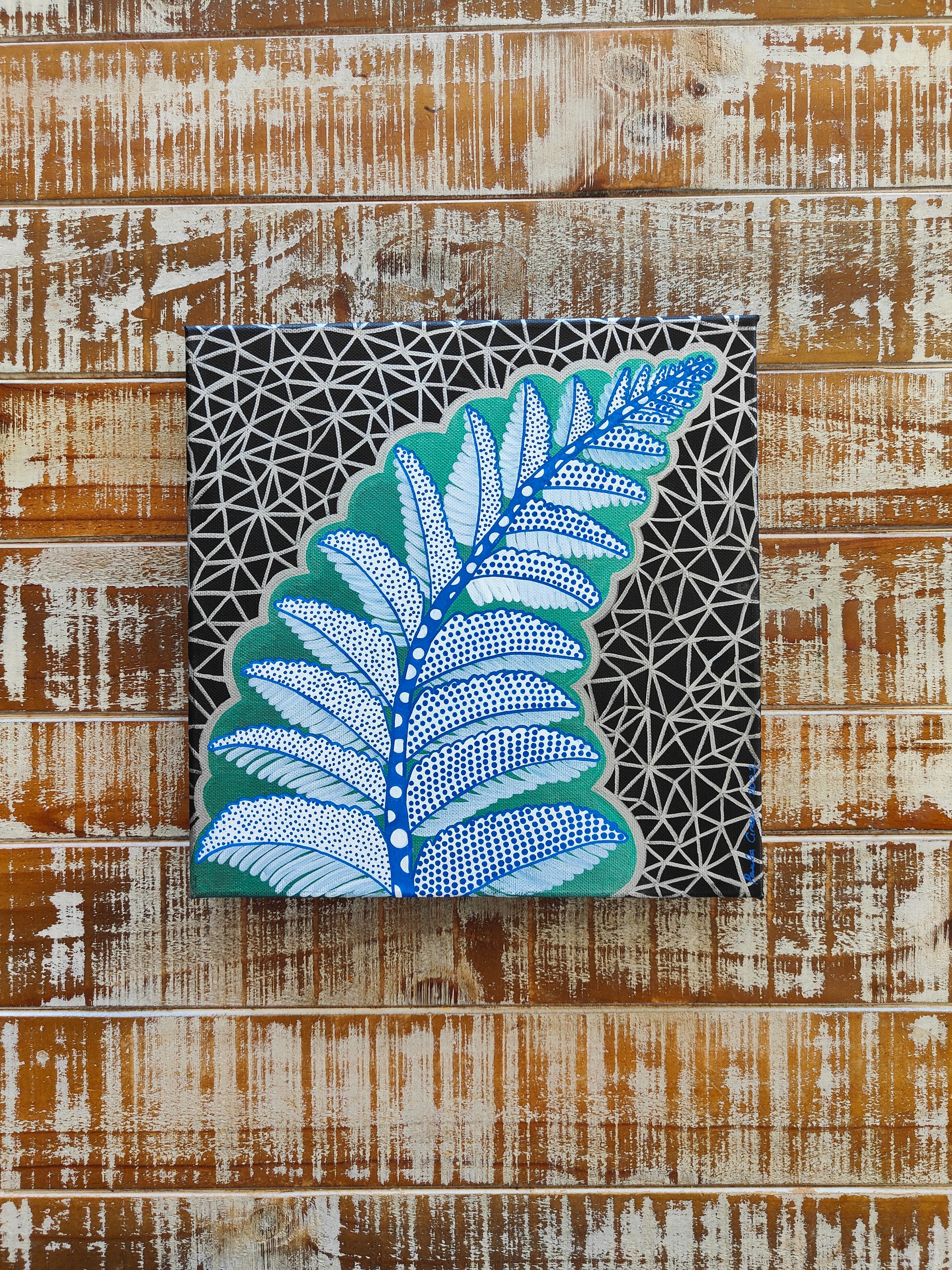 Silver Fern is an original 30cm x 30cm painting that makes for a beautiful and unique wall decoration. Its intricate details and vibrant colors will add a touch of elegance to any space. Part of the Flora series, Silver Fern reimagines the diversity of New Zealand Flora, focusing on its symbolic and practical significance. This artwork draws in the vibrant colours and distinctive shapes of the Silver Fern, offering a tribute to its beauty and enduring importance in te ao Māori.
